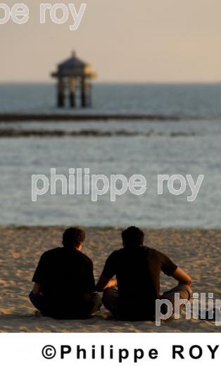 LA ROCHELLE - Quartier des Minimes - Jeunes assis sur la plage et la réplique du Phare du Bout du Mondee au soir - La Rochelle - 17 - Charente Maritime [Pas d'autorisation nécessaire]