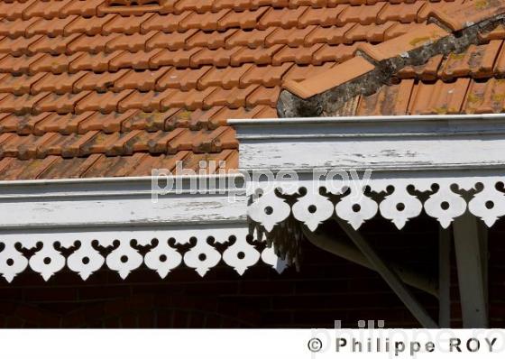 VILLA DE SOULAC SUR MER , MEDOC , GIRONDE , COTE D'ARGENT, COTE ATLANTIQUE , FRANCE. - Côte Atlantique , Côte d' Argent . - Villa ancienne du début du 20ème siècle . - Frise en bois ( lambrequin ) et toiture en tuiles mécaniques de villa . - Soulac sur Mer - 33 - Gironde. - [pas d'autorisation nécessaire]