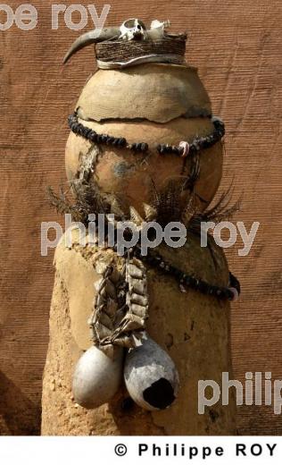 FETICHE, PORTE DE TATA, MAISON SOMBA, KOUSSOUKOINGOU , DISTRICT BOUKOUMBE, PROVINCE DE ATAKORA, BENIN, AFRIQUE. - Fétiche à l'entrée d'une maison fortifiée "Tata". Architecture traditionnelle de l'ethnie Somba (Bétamaribé), dans la chaine de montagne de l' Atakora. - Boukoumbé - BJ - Bénin. - [pas d'autorisation nécessaire]