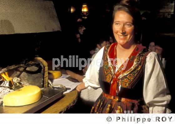 COSTUME, FEMME, EVOLENE, VAL HERENS, REGION VALAIS, ALPES, CONFEDERATION HELVETIQUE - Raclette au feu de bois et femme en costume traditionnel du Val d'Hérens. Raymonde. - Evolène - Valais - CH - Confédération Helvétique - [autorisation nécessaire]