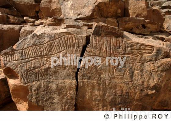 GRAVURE RUPESTRE, WADI MATKHENDUSH, MESSAK, SETTAFET, MURZUK, REGION WADI AL HAYAT, FEZZAN, DESERT, SAHARA, LIBYE, AFRIQUE NORD. - Gravures rupestes (3000 av JC) du wadi Matkhendush, plateau du Messak Settafet (Masak Mastafat), Murzuk. Crocodile. - Ubari - LY - Libye - [pas d'autorisation nécessaire].
