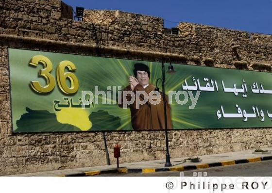 PANNEAU PROPAGANDE, EFFIGIE, KADHAFI, TRIPOLI, TRIPOLITAINE, MER MEDITERRANEE, LIBYE, AFRIQUE NORD. - Panneau de propagande à l'effigie du colonel Kadhafi, près du port . 36 eme anniversaire de la prise du pouvoir. - Tripoli - LY - Libye - [pas d'autorisation nécessaire]