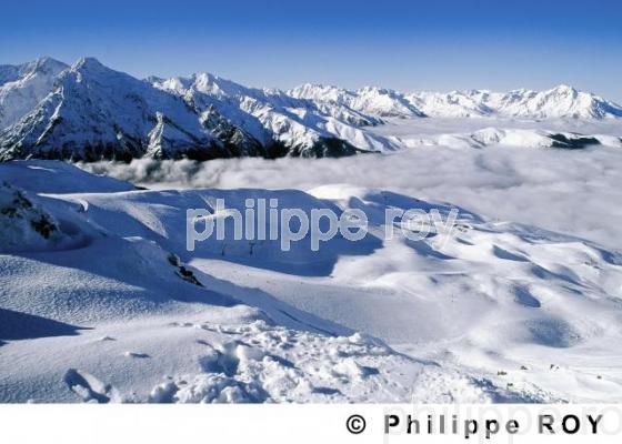 VALLEE DU LOURON , COMTE DE BIGORRE , PYRENEES , HAUTES PYRENEES, MIDI PYRENEES, FRANCE - La vallée du Louron et mer de nuages depuis les pistes de la station de Peyragudes - Peyragudes - 65 - Hautes Pyrénées - [pas d'autorisation nécessaire]