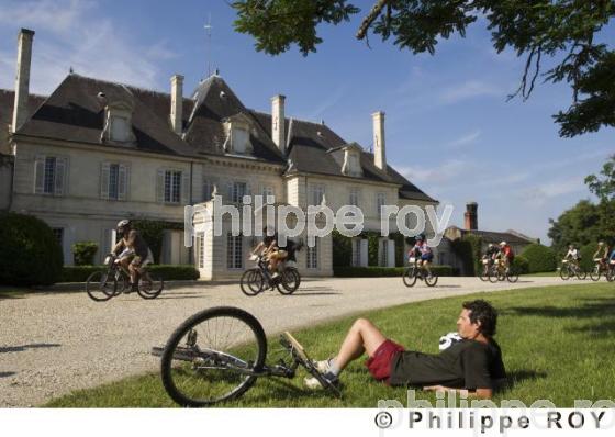 COURSE VTT, LA MEDOCAINE, OENOTOURISME, CHATEAU MALLERET , AOC MARGAUX, MEDOC, GIRONDE, AQUITAINE, FRANCE. - Cyclistes déguisés dans le parc du chateau Malleret 10 ème édition, le 31 mai 2008, de "La Médocaine", course grand public rassemblant 6.000 VTT et se déroulant à travers le vignoble de Margaux, dans le Médoc. Les déguisements sont primés et les châteaux traversés offrent une dégustation de vin. - Le Pian Médoc - 33 - Gironde - [autorisation nécessaire]