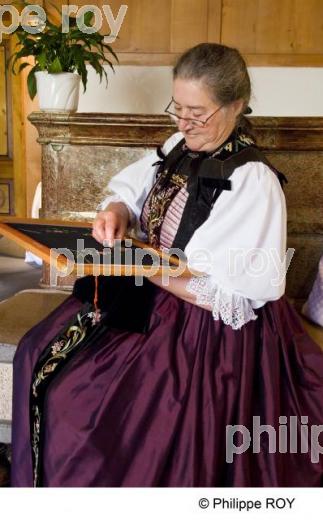 BRODERIE, COSTUME TRADITIONNEL, ATELIER MARTHA AMANN, VANDANS, MONTAFON, VORALBERG, AUTRICHE - Martha Aman, couturière, brodant un plastron pour costume traditionnel de femme du Montafon. Atelier de couture de Martha Amann. - Vandans - Voralberg - AT - Autriche - [pas d'autorisation nécessaire]