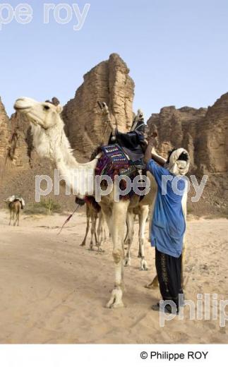 MEHAREE, TOUAREG, DROMADAIRE, ESSENDILENE, DESERT, SAHARA, PARC NATIONAL, TASSILI N' AJJER, DJANET, REGION ILLIZI, ALGERIE - Homme touareg, installant la selle du dromadaire de tête d'une méharée entre Essendilène ( Frison-Roche) et Djanet, dans le massif du Tassili N' Ajjer, parc national, patrimoine mondial UNESCO. - Djanet -Illizi - DZ - Algérie - [ pas d' autorisation nécessaire]