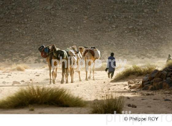 TOUAREG, MEHAREE, DESERT, SAHARA, PARC NATIONAL, TASSILI N' AJJER, DJANET, REGION ILLIZI, ALGERIE - Chamelier et caravanne de dromadaire, près de Djanet, dans le massif du Tassili N' Ajjer, parc national, patrimoine mondial UNESCO. - Djanet -Illizi - DZ - Algérie - [ pas d' autorisation nécessaire]