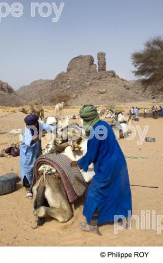TOUAREG, DROMADAIRE, MEHAREE, DESERT, SAHARA, PARC NATIONAL, TASSILI N' AJJER, DJANET, REGION ILLIZI, ALGERIE - Chamelier touareg préparant les dromadaires pour une méharée dans le désert, entre Essendilène ( Frison-Roche) et Djanet, dans le massif du Tassili N' Ajjer, parc national, patrimoine mondial UNESCO. - Djanet -Illizi - DZ - Algérie - [ pas d' autorisation nécessaire]