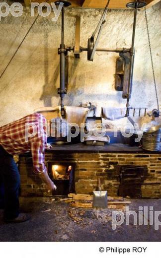 FOYER, MOULIN DE MASSON, COURREAU, VALLEE DU VIZEZY, FOREZ, LOIRE, RHONE ALPES, FRANCE - Ecomusée du moulin à eau de Masson sur le Vizézy. Préparation du foyer pour la cuisson du colza . - Courreau - 42 - Loire - [autorisation nécessaire]