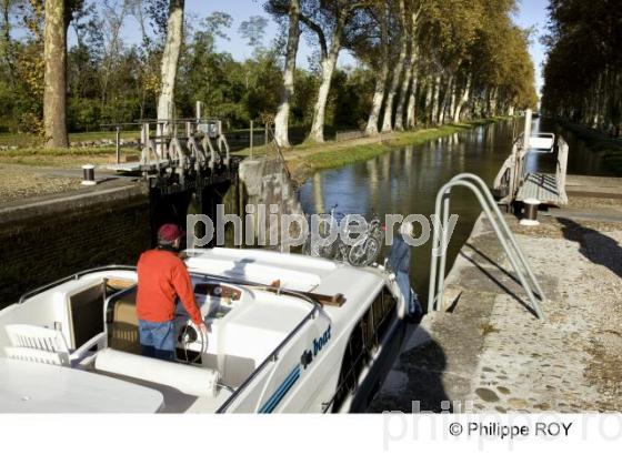 TOURISME FLUVIAL, ECLUSE, CANAL DU MIDI, MONTECH, LOMAGNE, GASCOGNE, VALLEE GARONNE, TARN ET GARONNE, MIDI PYRENEES, FRANCE - Pénichette de tourisme sur le Canal du Midi ( canal latéral à la Garonne) et passage d' écluse. - Montech - 82 - Tarn et Garonne - [Pas d'autorisation nécessaire]