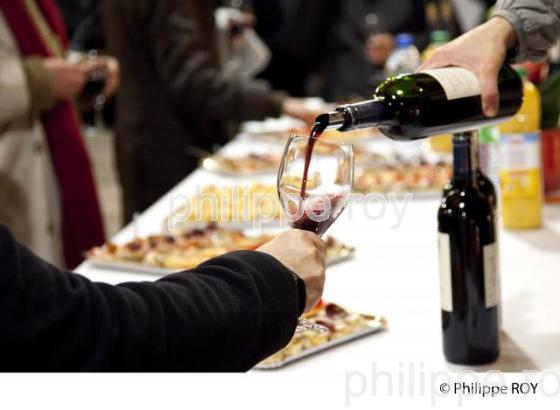DEGUSTATION, VIN, COKTAIL, CUVIER,CHATEAU DESMIRAIL, AOC, MARGAUX, MEDOC, CANTENAC, GIRONDE, AQUITAINE, FRANCE - Dégustation de vin et coktail dinatoire dans le Cuvier de vinification avec cuves en inox construit dans les anciens batiments de chai, chateau Desmirail , troisième cru classé 1855 . AOC Margaux, Médoc. - Cantenac - 33 - Gironde - [autorisation nécessaire]