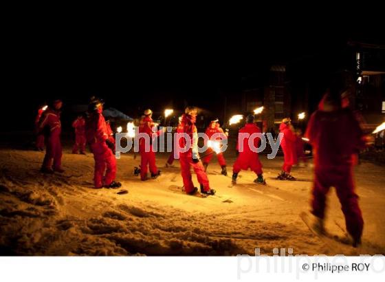 DESCENTE AUX FLAMBEAUX, STATION DE SKI DE PEYRAGUDES, LA NUIT, EN HIVER, LOUDENVIELLE, HAUTES PYRENEES, MIDI PYRENEES, FRANCE. - Loudenvielle - 65 - Hautes Pyrénées - [pas d'autorisation nécessaire]