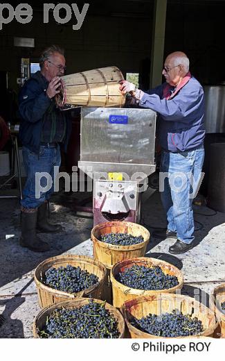 RECEPTION DE LA VENDANGE AU CHAI ET FOULOIR EGRAPPOIR DU DOMAINE DE LA SOURCE MARGUERITTE, VIGNOBLE DE L' ILE D' ORLEANS , SAINTE FAMILLE , PROVINCE DE QUEBEC, CANADA.