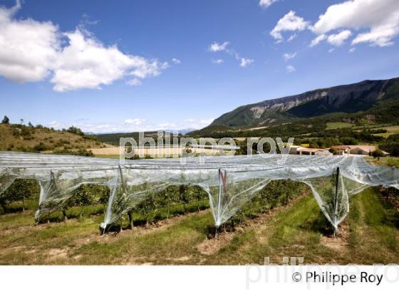 VERGER DE POMMIER ET FILET DE PROTECTION CONTRE LA GRELE , PAYS DE BUECH, ORPIERRE, HAUTES ALPES, PACA, PROVENCE ALPES COTE D' AZUR, FRANCE . - Orpierre - 05 - Hautes Alpes - [ pas d' autorisation necessaire ]