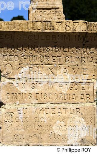 SOCLE DE LA CROIX DU VILLAGE DE MOLPRE DATEE DU 16EME SIECLE, GRAVE AU 19EME SIECLE PAR L'INSTITUTEUR EUGENE CHAUVIN, JURA (39), FRANCHE-COMTE, FRANCE