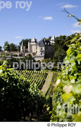 CHATEAU DE LA RIVIERE DOMINANT LA VALLEE DE LA DORDOGNE ET SES VIGNES, EN ETE, AOC FRONSAC, VIGNOBLE DE BORDEAUX, LA RIVIERE, GIRONDE, AQUITAINE, FRANCE