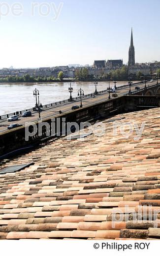 TOITURE EN TUILE TRADITIONNELLE, PLACE STALINGRAD, QUARTIER DE LA BASTIDE, LA GARONNE ET LA FLECHE DE L EGLISE SAINT MICHEL, BORDEAUX, COUVERTURE REALISEE PAR LA SOCIETE SECB GIRONDE, AQUITAINE, FRANCE.