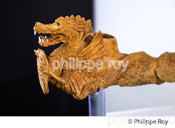 PIPE EN BRUYERE REPRESENTANT UN DRAGON, COLLECTION DU MUSEE D' INTERET NATIONAL DU TABAC, INSTALLE DANS LA MAISON PEYRAREDE, DITE CHATEAU HENRI IV, QUARTIER HISTORIQUE DE LA VILLE DE BERGERAC, PERIGORD POURPRE, DORDOGNE, AQUITAINE, FRANCE