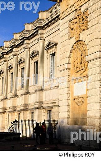 LE PALAIS DE JUSTICE, 19 EME SIECLE, STYLE NEOCLASSIQUE ET L' ARC DE TRIOMPHE, 17 EME SIECLE, CONSTRUIT A L' ENTREE DE LA VILLE , EN L' HONNEUR DE LOUIS XIV, QUARTIER HISTORIQUE DE MONTPELLIER, HERAULT, REGION LANGUEDOC ROUSSILLON, FRANCE.