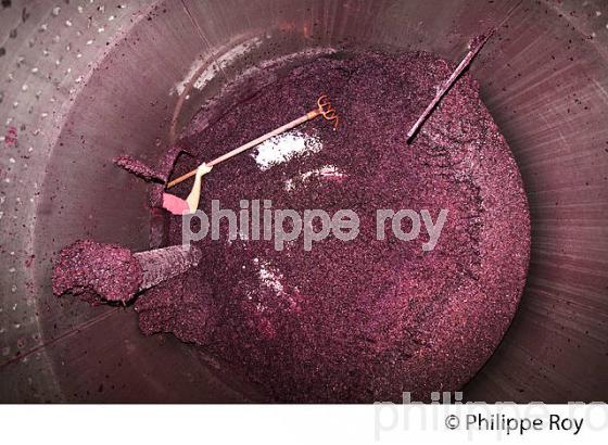 SORTIE DU MARC LORS DU DECUVAGE D' UNE CUVE DE VIN ROUGE APRES LA FERMENTATION, CHATEAU ENCLOS DE BAYARD, AOC MONTAGNE SAINT EMILION, COMMUNE DE MONTAGNE , GIRONDE, AQUITAINE, FRANCE.