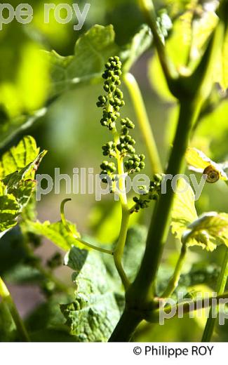 MANNE DE RAISIN , CYCLE VEGETATIF DE LA VIGNE AU PRINTEMPS, VIGNOBLE BORDELAIS, MONTAGNE, GIRONDE, AQUITAINE, FRANCE.
