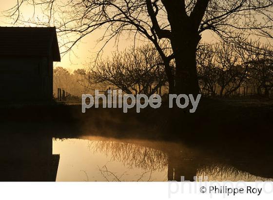 LEVER DU JOUR SUR l' ETANG ET LES VIGNES DU CHATEAU LAVERGNE DULONG, VIGNOBLE AOC BORDEAUX SUPERIEUR, VIN BIO, CULTURE EN BIODYNAMIE, MONTUSSAN, GIRONDE, AQUITAINE, FRANCE.