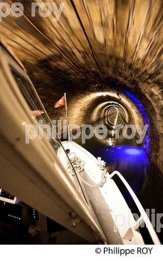 EXCURSION FLUVIALE SUR LE CANAL DE BOURGOGNE A BORD DE LA BILLEBAUDE, LA TRAVERSEE DU TUNNEL DE LA VOUTE DE POUILLY, POUILLY EN AUXOIS, PAYS DE L' AUXOIS, COTE D' OR, BOURGOGNE, FRANCE.