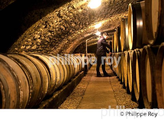 CHAI A BARRIQUES DANS LA CAVE SOUTERRAINE VOUTEE DE LA SOCIETE CHAMPY, NEGOCIANT ELEVEUR A BEAUNE, COTE D' OR , BOURGOGNE, FRANCE.