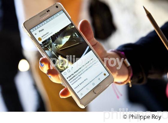AMELIE NOLLET, BLOGUEUSE, ANIMANT SON BLOG SPECIALISE VIN AVEC SON SMARTPHONE, DANS LA SALLE DE DEGUSTATION DU CHATEAU FERRANDE , AOC DES VINS DE GRAVES , VIGNOBLE DE BORDEAUX, CASTRES SUR GIRONDE, GIRONDE, AQUITAINE, FRANCE.