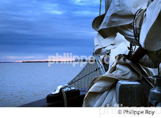 DECOUVERTE DE L' ESTUAIRE DE LA GIRONDE AU SOIR A BORD DU SINBAD, VIEUX GREEMENT TYPE GOELETTE A PARTIR DE BLAYE , GIRONDE , AQUITAINE, FRANCE.