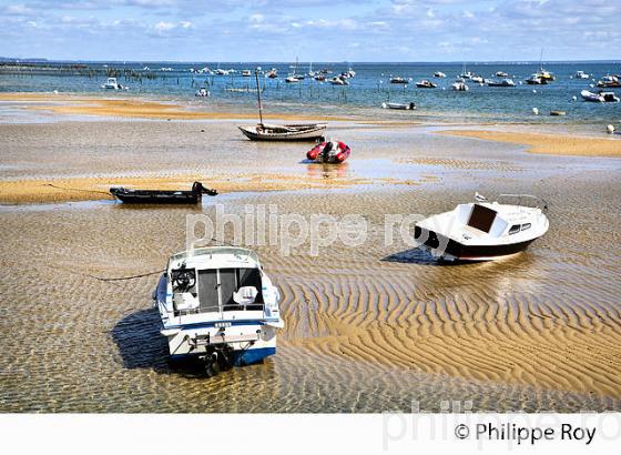 BATEAUX AU MOUILLAGE ET MAREE BASSE SUR LA PLAGE DU QUARTIER DES 44 HECTARES, A LA POINTE DU CAP FERRET , COMMUNE DE LEGE CAP FERRET , BASSIN D' ARCACHON, COTE ATLANTIQUE , GIRONDE, AQUITAINE, FRANCE.