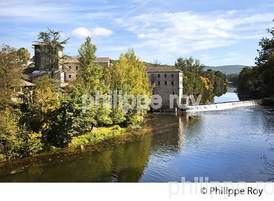 MOULIN HYDROLIQUE SUR LA RIVE DE L' AVEYRON ET RETENUE DE REGULATION DES EAUX, VILLAGE FORTIFIE DE MONTRICOUX, VALLEE DE L' AVEYRON, TARN ET GARONNE, MIDI-PYRENEES, OCCITANIE, FRANCE.