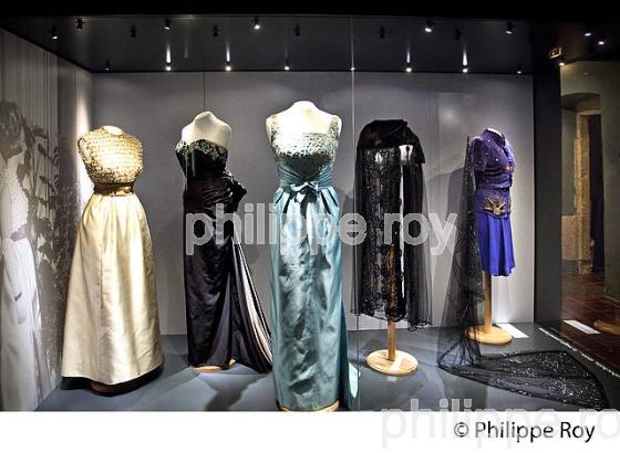 PRESENTATION D EROBES DE SOIREE DANS UNE VITRINE DU MUSEE DE LA MODE, 17 RUE DE LA SOUQUE, CENTRE HISTORIQUE DE LA VILLE D' ALBI, TARN, MIDI PYRENEES, OCCITANIE, FRANCE.