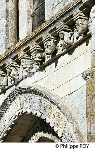 MODILLON ET FRISE DU PORTAIL, STYLE ROMAN DE L' EGLISE FORTIFIEE SAINT MARTIN D' ESNANDES, 12 EME, 15 EME SIECLE, VILLAGE D' ESNANDES, BAIE DE L' AIGUILLON , PARC NATUREL REGIONAL DU MARAIS POITEVIN, CHARENTE MARITIME , POITOU CHARENTES, NOUVELLE AQUITAINE, FRANCE.
