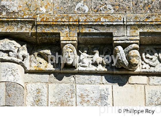 MODILLON ET FRISE DU PORTAIL, STYLE ROMAN DE L' EGLISE FORTIFIEE SAINT MARTIN D' ESNANDES, 12 EME, 15 EME SIECLE, VILLAGE D' ESNANDES, BAIE DE L' AIGUILLON , PARC NATUREL REGIONAL DU MARAIS POITEVIN, CHARENTE MARITIME , POITOU CHARENTES, NOUVELLE AQUITAINE, FRANCE.