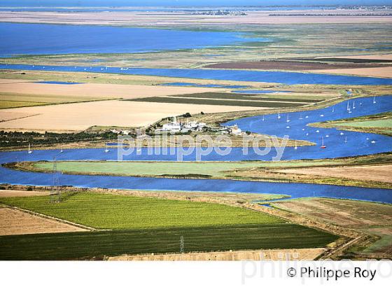 VUE AERIENNE SUR LES MEANDRE DE LA SEVRE NIORTAISE PRES DE SON EMBOUCHURE , LE PORT DU CORPS DE GARDE, LES CHAMPS AGRICOLES DU MARAIS , LA BAIE DE L' AIGUILLON ET LE PERTUIS BRETON, COMMUNE DE CHARRON, PARC NATUREL REGIONAL DU MARAIS POITEVIN, CHARENTE MARITIME , POITOU CHARENTES, NOUVELLE AQUITAINE, FRANCE.