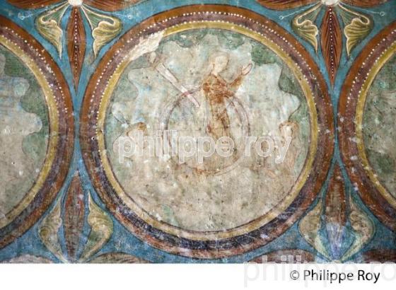 PEINTURE MURALE , 13 EME, MEDAILLON SAINTE CATHERINE SUBISSANT LE SUPPLICE DE LA ROUE, NEF DE L' EGLISE COLLEGIALE DU VILLAGE MEDIEVAL ET FORTIFIE DE SAINT EMILION, GIRONDE, AQUITAINE, NOUVELLE AQUITAINE, FRANCE.