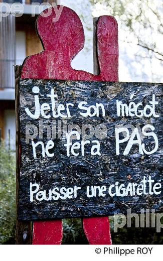 JETER SON MEGOT NE FERA PAS POUSSER UNE CIGARETTE, PANNEAU D' INFORMATION POUR LUTTER CONTRE LES INCIVILITES, ESPACE VERT DE L' ECOQUARTIER GINKO, QUARTIER DU LAC DE BORDEAUX EN ETE , VILLE DE BORDEAUX , GIRONDE, AQUITAINE, NOUVELLE AQUITAINE, FRANCE.