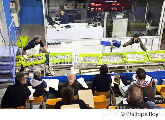 VENTE DU POISSON DANS LA SALLE DE TRANSACTION DE LA CRIEE DU PORT DE PECHE D' ARCACHON, VILLE D' ARCACHON, BASSIN D' ARCACHON, GIRONDE, AQUITAINE, NOUVELLE AQUITAINE, FRANCE.