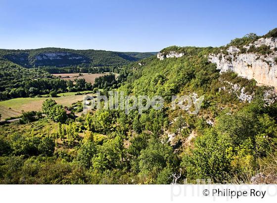 LA VALLEE DU CELE ET FALAISE DU PLATEAU CALCAIRE DU CAUSSE DE CAJARC, DOMINANT LE VILLAGE DE MARCILHAC SUR CELE, VALLEE DU CELE, PARC REGIONAL DES CAUSSES DU QUERCY, LOT, MIDI PYRENEES, OCCITANIE, FRANCE.