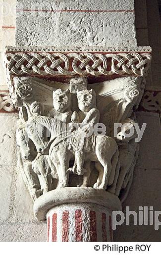 CHAPITEAU DE PILIER DE LA NEF DE L' ANCIENNE EGLISE ABBATIALE DU VILLAGE DE SAINTE ENGRACE, 11 EME SIECLE, STYLE ROMAN, , SOULE, PAYS BASQUE , PYRENEES ATLANTIQUE, AQUITAINE, NOUVELLE AQUITAINE, FRANCE.