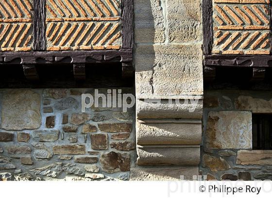 MUR DE BRIQUE ET ENCORBELEMENT, FERME TRADITIONNELLE DE BASSE NAVARE, VILLAGE DE GARRIS , VALLEE DE LA NIVE , BASSE NAVARRE , PAYS BASQUE, PYRENEES ATLANTIQUE, AQUITAINE, NOUVELLE AQUITAINE, FRANCE.