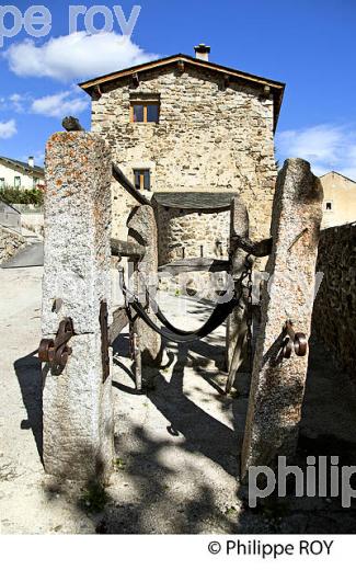 TRAVAIL EN PIERRE POUR FERRER LES BOEUFS ET MAISON TRADITIONNELLE DANS LE VILLAGE DE DORRES , ET PAYSAGE DU PLATEAU DE CERDAGNE , CATALOGNE , PARC NATUREL REGIONAL DES PYRENEES CATALANES , PYRENEES ORIENTALES , REGION LANGUEDOC ROUSSILLON, OCCITANIE, FRANCE.