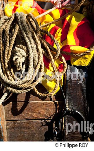 HARNACHEMENT D' UN MULET POUR LA FETE DES VENDANGES DE LA CITE VITICOLE DE BANYULS SUR MER, ET COULEURS CATALANES , COTE VERMEILLE, MER MEDITERRANEE , PYRENEES ORIENTALES , REGION LANGUEDOC ROUSSILLON, OCCITANIE, FRANCE .