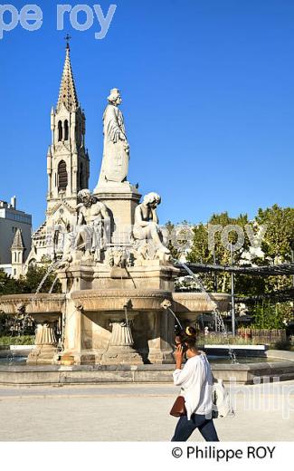 FONTAINE PRADIER, ESPLANADE CHARLES DE GAULLE, ET EGLISE SAINTE PERPETUE, VILLE DE NIMES , GARD, LANGUEDOC.