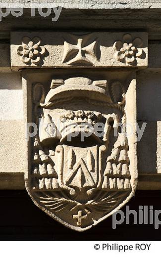 ARMOIRIES RELIGIEUSES SCULPTEES SUR LE LINTEAU DU PORTAIL D' ENTREE DE LA GRANDE MAISON, 12 BOULEVARD LUCIEN ARNAULT, CENTRE HISTORIQUE DE LA VILLE DE MENDE , VALLEE DU LOT, MASSIF DES CEVENNES , GEVAUDAN, LOZERE, LANGUEDOC ROUSSILLON, OCCITANIE, FRANCE.