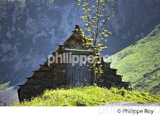 GRANGE FORAINE TRADITIONNELLE A PIGNON A REDANS, L' ESTIVE DU PLATEAU DE SAUGUE, COMMUNE DE GEDRE GAVARNIE, PAYS TOY, LAVEDAN, BIGORRE, HAUTES PYRENEES, MIDI-PYRENEES, OCCITANIE, FRANCE.