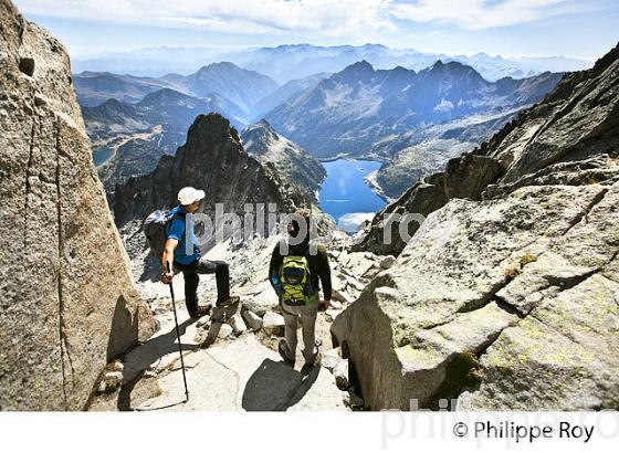 LE GUIDE PASCAL PELLAREY ET RANDONNEUR DANS LES DALLES DE GRANIT, SOUS LE SOMMET DU PIC DU NEOUVIELLE, 3091 METRES , LE LAC DE CAP DE LONG, 2160 METRES, LE PIC BUGATET, 2877 METRES, LE PIC MECHANT, 2944 METRES, EN ARRIERE PLAN, LE MASSIF DU LUCHONNAIS ET LE PIC D' ANETO, 3404 METRES, CHAINE DES PYRENEES, MASSIF DU NEOUVIELLE, RESERVE NATURELLE DU NEOUVIELLE, VALLEE D' AURE, PARC NATIONAL DES PYRENEES OCCIDENTALES, COMMUNE DE SAINT LARY SOULAN, HAUTES PYRENEES , MIDI PYRENEES, OCCITANIE, FRANCE.