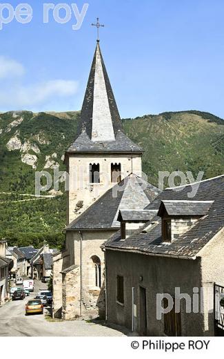 L' EGLISE NOTRE DAME DE BOURISP, 16 EME SIECLE, STYLE ROMAN ET MAISONS TRADITIONNELLES AVEC TOITURE EN ARDOISE, DU VILLAGE DE BOURISP, VALLEE D' AURE, HAUTES PYRENEES , MIDI PYRENEES, OCCITANIE, FRANCE.
