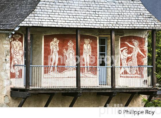 FRESQUE MURALE EN SGRAFFITE ET GALERIE DU CHATEAU DES NESTES, DIT CHATEAU CAMOU, 17 EME SIECLE, AU CONFLUENT DE LA NESTE D' AURE ET DE LA NESTE DU LOURON, ANCIENNE COMMANDERIE ET JURIDICTION D'AURE, ABRITE L' OFFICE DE TOURISME ET LE MUSEE CAGOTS , VILLAGE D' ARREAU, VALLEE D' AURE, HAUTES PYRENEES , MIDI PYRENEES, OCCITANIE, FRANCE.